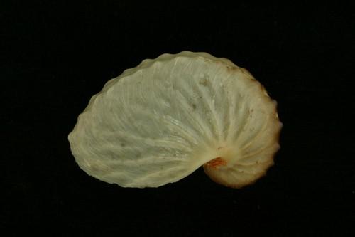 - 形態特徵:殼為軟體所分泌的卵囊,作為產卵所用。殼小,質薄,鸚鵡螺狀,直徑約可達10公分,殼表面平滑,背脊寬,殼上約有35條肋放射肋,與背脊相交處形成圓形瘤突。殼色為象牙白,放射肋周圍為淺褐色,殼面和背脊交接處為深褐色。
