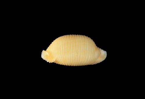 - 形態特徵:殼背黃褐色,橫肋兩邊對稱排列,並延伸致腹面相連接,貝殼上下兩端突起呈尖銳狀,外形特殊而不似其他寶螺殼表之光滑