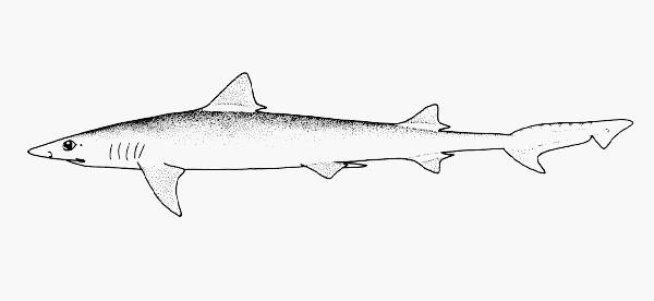 - 型態特徵:體細而延長。頭平扁,尾鰭前具凹窪。吻中長,吻端背視如圓弧形。眼橢圓形,具瞬膜。前鼻瓣如短葉片狀。鰓裂短,長度為眼徑之1.1-1.3倍。口裂呈弧狀,很短;唇溝一般長;上頜齒側扁三角形,齒頭外斜,內緣光滑稍凸,外緣亦光滑而內凹,不具小齒尖,僅正中具一尖直小齒;下頜齒細尖,矛狀,邊緣光滑,不具小齒尖,齒頭幾乎不彎曲而呈T形,口閉時下頜齒不突出。噴水孔小。盾鱗具5棘突5縱脊。背鰭2個,形狀相同,第二背鰭較小;前緣圓凸,後緣深凹,上角鈍尖,下角延長尖突;第一背鰭起點在胸鰭內角之上方或稍後;第二背鰭起點在臀鰭之前;腹、臀鰭皆較第二背鰭小;胸鰭等大或略大於第一背鰭,略呈鐮刀狀;尾鰭狹長,稍大於頭長,上葉近尾端,下葉前部尖三角形突出,中部較低平,與後部間有一深缺刻,後部小三角形突出,尾端鈍尖。體側灰褐色,腹面淡白,無其它明顯斑紋。