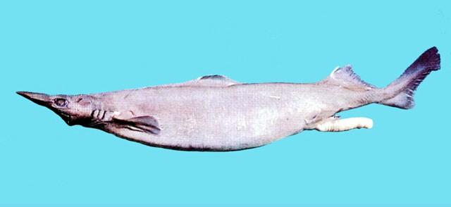 - 型態特徵:體延長,前部寬而平扁;頭平扁;尾柄側扁,尾柄無尾前凹窪和側脊;吻延長甚多,吻長超過一半頭長,大於從口裂到胸鰭起點之距離;鼻孔內緣到吻端之距離為口前吻長的2/5;眼大,長橢圓形,無瞬膜和瞬褶;眼前緣距吻端和距第一鰓裂約相等;鼻孔小,橫列,外側位,長約鼻孔間距的1/3-1/2,前鼻瓣具有一個三角形突出,後鼻瓣發達;口寬大,淺弧形,口寬約為口前吻長的1/2;兩顎齒外露,閉口時上下顎兩側具空隙;上下唇褶發達,上唇褶較長;齒式13-15 + 13-15/14-15 + 1 + 14-15,齒小而側扁,一行在使用,上下齒不同形,邊緣光滑無鋸齒,基底較寬;上顎齒齒頭直立,近口角處稍外斜,下顎齒齒頭向外甚斜;頦褶發達;噴水孔大,斜橢圓形,位於眼後方;鰓裂約等大;盾鱗三叉形,具三棘突,三縱脊,約0.5公釐。背鰭二枚,各具一硬棘,硬棘皆具有溝槽;第一背鰭低而長,起點在胸鰭後緣稍後方,距吻端比距第二背鰭遠,棘短,約等於鰭前緣的1/2,垂直高約為基底長的1/5,後緣幾乎平直,後角尖突;第二背鰭大,略高於第一背鰭,起點與腹鰭基底末端相對,距尾鰭起點比距第一背鰭近,棘較長,約與鰭的前緣等長;上角尖,後緣凹入,下角尖突;第二背鰭基底長約等於第一背鰭基底長之2/3;尾鰭長,尾椎軸幾乎平行,上葉發達,後緣有一缺刻;腹鰭低平,起點約位於兩背鰭之間後1/3處,前後緣連續,呈半弧形,後角尖突;鰭腳扁而延長,末端尖突微彎;胸鰭中大,幾乎呈長方形,邊緣幾乎平直,外角和內角圓。體灰褐色,腹部色稍淺,各鰭色較深,鼻緣、口緣和鰓裂處呈黑褐色。
