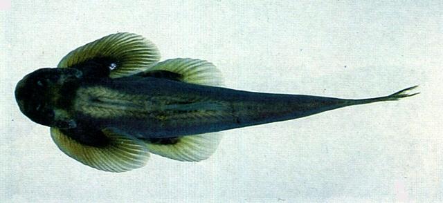 - 型態特徵:體較為延長,前部扁平,後部側扁。頭部至腹鰭之間的身體呈三角形,腹面頗為平坦。頭中大,平扁。吻部略呈圓弧狀。口下位,口裂略呈弧狀。上頜上方的腹面具2-3對短鬚。體被細小圓鱗,頭部及胸部的內側均裸出無鱗。側線完全。背鰭基部較短,起點在腹鰭起點之後上方,軟條 3(不分枝軟條)+ 8(分枝軟條);臀鰭3(不分枝軟條)+ 5(分枝軟條);腹鰭向兩側平展,內側互相靠近,在基部癒合,後緣則分離,6-7(不分枝軟條)+ 10-12(分枝軟條);胸鰭寬大而平展,末端已達腹鰭基部;尾鰭凹形。體呈淺褐色或灰黑色,雄魚體背及頭具有蠕狀的波浪紋,偶有半圓之白斑;各鰭淡黃褐色,背、尾鰭具有黑白相間之條紋。
