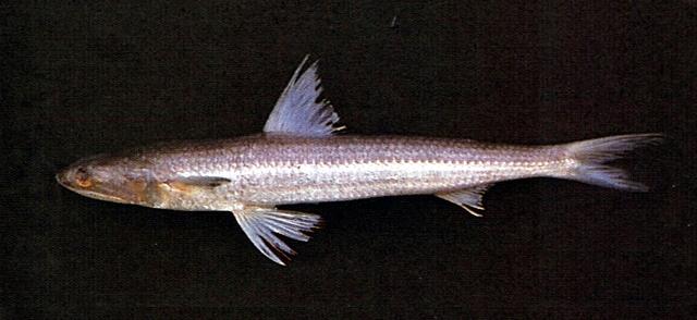 - 型態特徵:體圓而瘦長,呈長圓柱形,尾柄兩側具稜脊。頭較短。吻尖,吻長明顯大於眼徑。眼中等大;脂性眼瞼發達。口裂大,上頜骨末端遠延伸至眼後方;頜骨具銳利之小齒;外側顎骨齒前方3列,後方2列。體被圓鱗,頭後背部、鰓蓋和頰部皆被鱗;側線鱗數59-65;背鰭前鱗20-30。單一背鰭,具軟條10-12;有脂鰭;臀鰭與脂鰭相對;胸鰭短,末端遠不及腹鰭起點上方;尾鰭叉形。體背呈暗褐色,腹部為淡色,體側無任何斑塊或橫紋。背、胸及尾鰭略呈青灰色;腹及臀鰭無色。