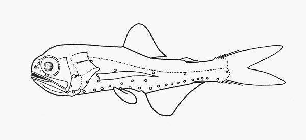 - 型態特徵:體延長,側扁。頭中大。吻鈍尖。眼大。口頗大,上頜末端延伸至前鰓蓋後緣;上下頜、鋤骨、顎骨、中翼骨及舌面均具小齒。體被弱圓鱗,易脫落;側線平直。背鰭單一,位於體中部,具軟條12-14(通常為13),後部另具一脂鰭;臀鰭基底明顯長於背鰭基底,具軟條18-20(通常為19);尾鰭叉形,尾鰭副鰭條柔軟。各部位之發光器位置於下:鼻部背位發光器(Dn)小型;鼻部腹位發光器(Vn)無;眶下位發光器(So)無;鰓蓋位發光器(Op)2個,位於前鰓蓋後緣,其中的第2鰓蓋發光器(Op2)位於眼下緣縱線上;鰓被架位發光器(Br)3個;胸鰭上方發光器(PLO)位於側線與胸鰭基間,接近側線處;胸鰭下方發光器(PVO)2個,兩者均呈水平狀,與PO1不同在一直線上;胸部發光器(PO)5個,前4個幾呈水平狀,最後1個昇高;腹部發光器(VO)4個,VO2位於VO1及VO3之間的上方,在PVO及SAO1水平線的下方;腹鰭上位發光器(VLO)位於腹鰭和側線之間,接近側線處;臀鰭上方發光器(SAO)3個,三者排列呈鈍角狀,SAO1位於VO3和VO4間的上方,SAO3緊臨側線的下方;體後側位發光器(Pol)1個,位於脂鰭下方,緊臨側線;臀鰭前部發光器(AOa)6個,沿臀鰭基底水平狀排列;臀鰭後部發光器(AOp)4個,沿尾柄腹側狀排列,其間距大於發光器的直徑;尾鰭前位發光器(Prc)2個,Prc2在側線下方,其間距大於發光器的直徑;雄魚具3-5個透明的尾上腺(SUGL)及小的尾下腺(INGL);雌魚有小的尾上腺(SUGL)及數個更小的瓦狀尾下腺(INGL)。