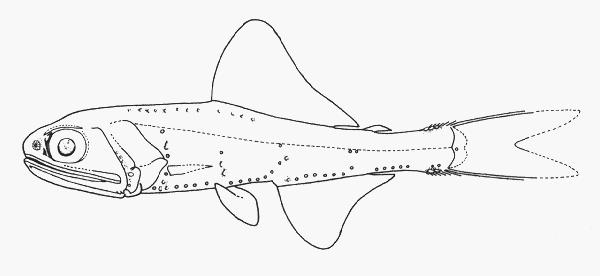 - 型態特徵:體延長,側扁,後部略細。頭長形而大。吻短,前端鈍。眼大。口大,上頜骨狹長而延伸至前鰓蓋後緣,末端略擴大;上下頜絨毛齒,內列齒延長;鋤骨及顎骨均具齒帶。體被大而薄圓鱗,易脫落;側線平直。背鰭單一,位於體中部,具軟條26,後部另具一脂鰭;臀鰭基底短於背鰭基底,具軟條20;尾鰭叉形,尾鰭副鰭條堅硬、棘狀。各部位之發光器位置於下:鼻部背位發光器(Dn)小而長形;鼻部腹位發光器(Vn)小而圓形;鰓蓋位發光器(Op)2個,位於前鰓蓋後緣下方,Op1明顯較Op2小,均在眼眶下緣縱線之下;胸鰭上方發光器(PLO),距側線比距胸鰭基部近;胸鰭下方發光器(PVO)2個,兩者互為垂直排列,分別位於胸鰭基底上下方;胸部發光器(PO)5個,PO5位置突然昇高;腹部發光器(VO)4個,水平排列;腹鰭上位發光器(VLO)位於腹鰭和側線之中間,或略接近側線;臀鰭上方發光器(SAO)3個,三者排列呈鈍角狀,SAO3在側線下緣;體後側位發光器(Pol)2個,在脂鰭下方,側線下緣,呈水平排列;臀鰭前部發光器(AOa)7個,水平排列,最後一個明顯上昇;臀鰭後部發光器(AOp)4個,水平排劉;尾鰭前位發光器(Prc)3個,前二個水平排列,Prc3在側線下緣之。雄魚尾上部發光腺(SUGL)具8-10個發光斑塊。身體其它若幹部位具許多小發光腺,如背鰭基部等。