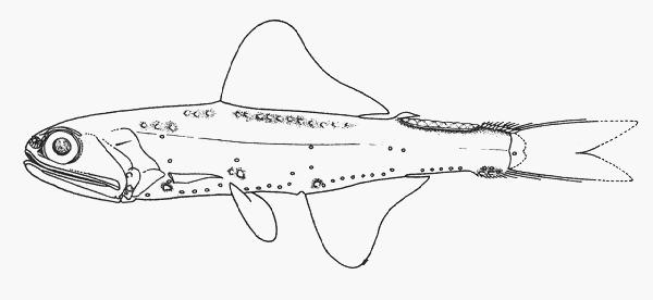 - 型態特徵:體延長,側扁,後部略細。頭長形而大。吻短,前端鈍。眼大。口大,上頜骨狹長而延伸至前鰓蓋後緣,末端略擴大;上下頜絨毛齒,內外列齒等長;鋤骨及顎骨均具齒帶。體被大而薄圓鱗,易脫落;側線平直。背鰭單一,位於體中部,具軟條21-24,後部另具一脂鰭;臀鰭基底短於背鰭基底,具軟條19-20;尾鰭叉形,尾鰭副鰭條堅硬、棘狀。各部位之發光器位置於下:鼻部背位發光器(Dn)小而長形;鼻部腹位發光器(Vn)小而圓形;鰓蓋位發光器(Op)2個,位於前鰓蓋後緣下方,Op1明顯較Op2小,均在眼眶下緣縱線之下;胸鰭上方發光器(PLO),距側線比距胸鰭基部近;胸鰭下方發光器(PVO)2個,兩者互為垂直排列,分別位於胸鰭基底上下方;胸部發光器(PO)5個,PO5位置突然昇高;腹部發光器(VO)4個,水平排列;腹鰭上位發光器(VLO)位於腹鰭和側線之中間,或略接近側線;臀鰭上方發光器(SAO)3個,三者排列呈鈍角狀,SAO3在側線下緣;體後側位發光器(Pol)2個,在脂鰭下方,側線下緣,呈水平排列;臀鰭前部發光器(AOa)7個,水平排列,最後一個明顯上昇;臀鰭後部發光器(AOp)4個,水平排劉;尾鰭前位發光器(Prc)3個,前二個水平排列,Prc3在側線下緣之。雄魚尾上部發光腺(SUGL)具8-10個發光斑塊。身體其它若幹部位具許多小發光腺,如背鰭基部等。
