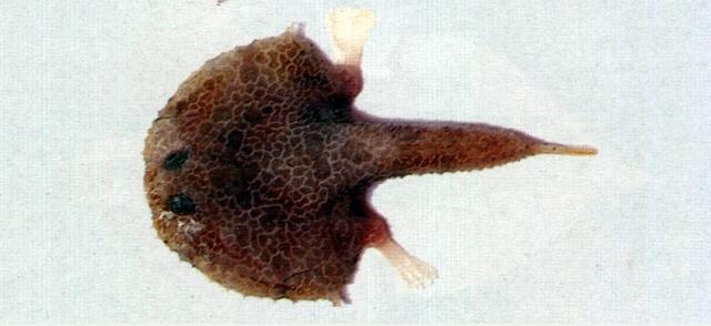- 型態特徵:體盤近似卵圓形,甚平扁。吻短而不突出,前緣截形,無吻棘。口小,前位,下頜略突出;上下頜及舌上具絨毛狀齒,顎骨具齒。下鰓蓋骨棘突起。背面及腹面密被顆粒狀或盾鱗之小棘;體盤及尾部邊緣則具骨質突起。背鰭兩個,第一背鰭特化呈吻觸手,藏於吻部凹槽內;第二背鰭位於尾部,具軟條3;臀鰭位於肛門及尾鰭基部中央,具軟條4;胸鰭中長,水平伸展;尾鰭圓形。體背褐色,密佈淺灰色雲狀斑紋,腹面白色。
