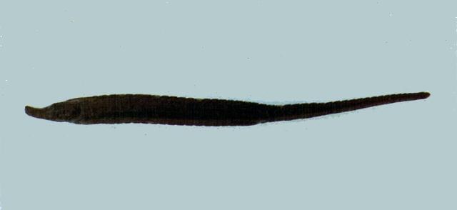 - 型態特徵:體特別的延長和纖細,無鱗,由一系列的骨環所組成;軀幹部的上側稜與尾部上側稜相連接,下側稜則止於臀部骨環附近而不與尾部相接,中側稜則與尾部下側稜相接。吻部背中稜完全,但不特別高起。主鰓蓋具一完全的中縱稜。體環具弱縱棘;無皮瓣。骨環 18-21 + 21-25;背鰭鰭條數 27-34;胸鰭鰭條數 20-21;尾鰭鰭條數 10。體黑褐色,體側具有內含小白眼點之黑點,背部另具白色斑。雄魚的特徵是具垂直列之銀白小點 ;雌魚及小魚則是在每一軀幹部的骨環有4個側點或斑塊。