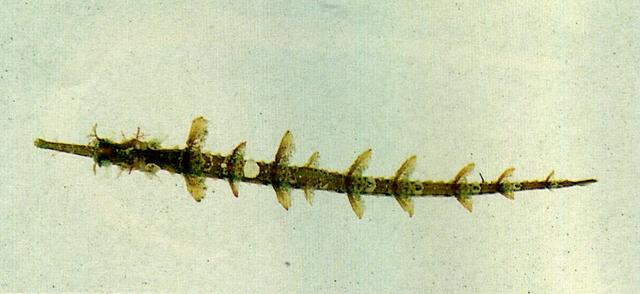 - 型態特徵:體特別的延長和纖細,無鱗,由一系列的骨環所組成;軀幹部的上側稜與尾部上側稜不相連接,下側稜則止於臀部骨環附近而不與尾部相接,中側稜則與尾部下側稜相接;體環緣邊均細棘齒;背鰭基底下方之體環背部隆起。吻略長,頭長為其1.5-1.9倍;吻部背中稜完全,具短棘突及小刺,側吻棘存在。主鰓蓋具一完全的中縱稜。體環無弱縱棘;頭部及身體均具大型葉狀皮瓣。骨環 14-15 + 25-27;背鰭鰭條數 18-19;胸鰭鰭條數16-19;尾鰭鰭條數 10。體色多變,由褐色至淡紅色皆有,有時散在雜斑或斑帶。