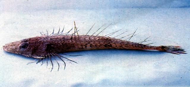 - 型態特徵:體延長,頭部與軀幹前部都極為扁平,愈往尾部則愈狹小。具兩對鼻孔。眼大,位於上側位。上下頜、鋤骨及口蓋骨具細齒;上下頜等長。鰓膜與喉峽部連合。體無鱗,頭及軀幹的背面及上半部均被骨板,其上具硬棘;側線完全,每個側線盾板上有一強棘及弱棘。前鰓蓋骨具二長棘。下頜腹側無棘。D1. VI,D2. 15;A. 16-17;P. 13+2-3;L.l. 27;GR.12-15。體長為頭長的2.46-2.67倍;頭長為吻長的2.61-3.33倍、眼徑長的4.25-5.27倍、兩眼間距的3.06-3.33倍。背鰭的棘短且弱,軟條稍長;胸鰭的鰭條甚長可達臀鰭第九鰭條基部;下方游離鰭條短且有膜相連。背面體側具四條黑褐色的寬橫帶,而以最後橫帶之顏色最濃;前鰓蓋骨、鰓蓋骨及眼前骨均有不規則的暗斑;第一背鰭亦有不明顯的斑點,而其他鰭顏色較淡。