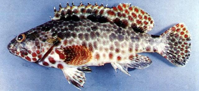 - 型態特徵:體長橢圓形,側扁而粗壯,標準體長為體高之2.8-3.4倍。頭背部弧形;眶間區略凸。眼小,短於吻長。口大;上下頜前端具小犬齒或無,兩側齒細尖,下頜約3-5列。鰓耙數7-9+14-16。前鰓蓋骨後緣微具鋸齒,下緣光滑。鰓蓋骨後緣具3扁棘。體被細小櫛鱗;側線鱗孔數54-60;縱列鱗數89-100。背鰭鰭棘部與軟條部相連,無缺刻,具硬棘XI,軟條14-15;臀鰭硬棘III枚,軟條8;腹鰭腹位,末端延伸不及肛門開口;胸鰭圓形,中央之鰭條長於上下方之鰭條,且長於腹鰭,但短於後眼眶長;尾鰭圓形。頭部及體側呈淺褐色,滿佈約等於瞳孔之六角形暗斑,斑間隔極狹。體背沿背鰭基底至基底有5個黑斑,前四個延伸至背鰭;眼後具1黃褐色大斑點,另有1較小班點緊接於其後。胸鰭紅褐色而具黃色線紋及斑點;餘鰭則具暗褐色或紅褐色斑點及白色小點。