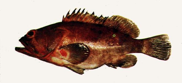 - 型態特徵:體長橢圓形,側扁而粗壯,標準體長為體高之2.7-3.2倍。頭背部斜直;眶間區微凸。眼小,短於吻長。口大;上下頜前端具小犬齒或無,兩側齒細尖,下頜約2-3列。鰓耙數6-8+14-16。前鰓蓋骨後緣微具鋸齒,下緣光滑。鰓蓋骨後緣具3扁棘。體被細小櫛鱗;側線鱗孔數48-53;縱列鱗數86-98。背鰭鰭棘部與軟條部相連,無缺刻,具硬棘XI,軟條16-18;臀鰭硬棘III枚,軟條8;腹鰭腹位,末端延伸不及肛門開口;胸鰭圓形,中央之鰭條長於上下方之鰭條,且長於腹鰭,但短於後眼眶長;尾鰭圓形。體呈紅色至綠褐色,每一個鱗片具一個小白點或淡藍色點;體側具4條不顯著之橫帶,且僅延伸至背鰭基部,另一條位於尾柄上;胸鰭基部具一紅斑。