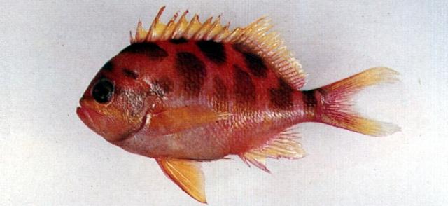 - 型態特徵:體延長而高,標準體長為體高之2.1-2.3倍。頭背部弧形;眶間區平坦或略凹陷。吻短而略鈍圓。上頜骨末端延伸至眼中部之下方;上下頜、顎骨、鋤骨及舌面均具齒,其中鋤骨齒帶呈菱形。下鰓蓋及間鰓蓋後緣具鋸齒。鰓耙數10-13+22-28。體被細小櫛鱗,下頜骨具鱗;側線鱗孔數39-41。背鰭連續,無缺刻,有硬棘X枚,軟條16-17,第III棘顯然較第IV棘長,第3軟條略為延長,但不呈絲狀;臀鰭硬棘III枚,軟條7;腹鰭腹位,末端不及肛門開口,第2軟條略延長;胸鰭短於頭部長;尾鰭深內凹形。體呈橘紅色,體側具黃褐色大斑點;各鰭偏黃。