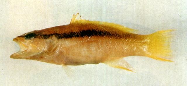 - 型態特徵:體極為延長,標準體長為體高之3.8-3.9倍。頭背部斜直;眶間區平坦或略凹陷。吻較長而略突出。上頜骨末端延伸至眼中部之下方;上下頜具齒。前後鼻孔遠離,前鼻孔近於吻端。前鰓蓋骨下緣無前向棘。鰓耙數6-7+12-14。體被細小櫛鱗,上頜骨具鱗;側線鱗孔數47-52。背鰭連續,具缺刻,有硬棘VIII枚,軟條13,第VIII棘長於第VII棘;臀鰭硬棘III枚,軟條9;腹鰭腹位,末端不及肛門開口;胸鰭短於頭部長;尾鰭內叉形。體一致為橘黃色,體側自吻端至尾柄上部有一條黑色寬縱帶。各鰭鮮黃色;腹鰭淡色。