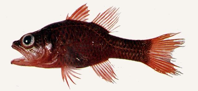 - 型態特徵:體長圓而側扁。頭大。吻長。眼大。D. VI-I,9; A. II,8; P. 13; C. 3-4,9+8,3-4; Pred.S. 7-8;Ll. 23; GR. 5,9+1+3,2; HL.2.44-2.58;BD. 2.59-2.79 in SL;SnL. 3.58-4.11;ED. 3.25-2.87 in HL。體一致為暗紅色,各個鱗片具褐色緣,浸泡福馬林後體呈灰色。體側無任何縱帶或斑點。各鰭紅色;尾鰭基底附近之鱗較小且色素分佈較密而呈現一塊較暗區域。 本種和A. unicolor相較在側線上方有較少的鱗;而其平均標準體長為10公分左右。