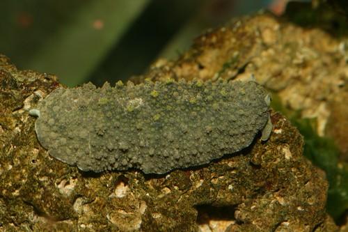 - 形態特徵:無殼,外觀呈長橢圓狀,膨脹。外套膜為黃綠色的底,其上密佈灰黑色斑。體表密佈大小不一的瘤突。前端具觸角一對,頂端有眼點。腹足灰綠色。