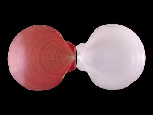 - 形態特徵:殼形為圓形,雙殼同形,但左殼紅棕色,右殼乳白色。左殼外面平滑有如年輪般的成長輪,自殼頂向腹緣有二十五到三十五條褐色放射線,其內面為白色,周緣則為紅棕色有相對數目的白色放射肋。右殼外面光滑乳白色,其內面亦有相對數目的白色放射肋。殼的內面可以清楚的看到閉殼肌痕。