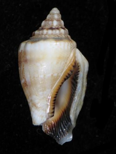 - 形態特徵:殼形:殼厚實,輪廓較方,螺層有很多小結節和少許的縱肋。肩部圓滑或是有大而鈍的肩瘤。縫線明顯。殼口內齒狀襞發達。外唇及軸唇加厚。外唇緣有明顯的Stromboid notch。 殼色:乳白色底有帶狀斑,底面有一深褐色斑塊,軸唇邊緣橙色,外唇之齒狀襞白色,齒狀襞間深色。殼口內側色較淡。 大小:小型,14-30 mm。(32.3×14.1 mm)