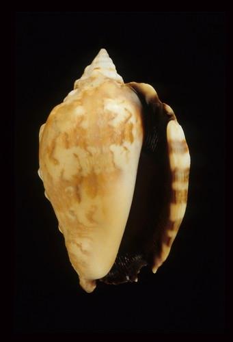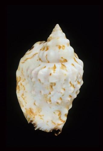 - 形態特徵:殼形:殼中等厚,方型略圓。螺塔高,螺層有瘤、螺紋及縱紋;體層除了肩部有發達的肩瘤外,尚有3-5排較小的瘤,有螺紋。外唇外翻加厚,呈波浪狀,尤其是前端Stromboid notch 處更明顯,有發達的齒狀襞。軸唇滑層薄,但幾乎覆滿整個口面之體層。 殼色:乳白色底有不規則的褐斑及條紋。殼口黑褐色,軸唇淡黃色或白色 大小:中型,38-70mm。(63.3×39.4 mm)