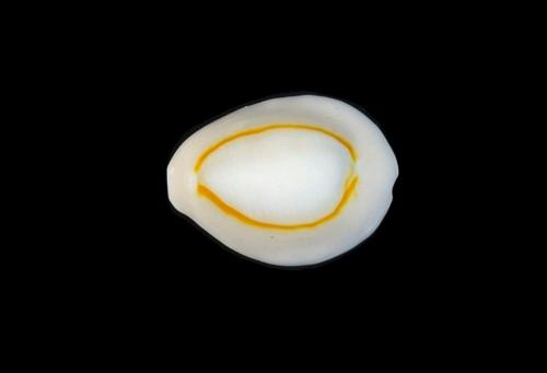- 形態特徵:殼近橢圓形。殼表光滑,前端寬,後端窄,白色或淡灰綠具一圈橙黃色環紋,側面及腹面為白色。殼口的齒列稍粗,齒溝稍長。