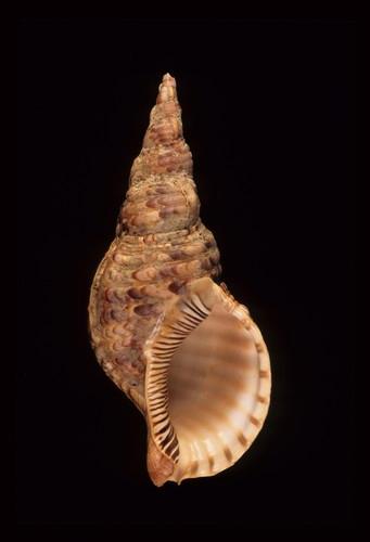 - 形態特徵:貝殼十分大型,有粗大的低螺肋,縫合溝下有縱肋,貝殼淡紫褐色,而有濃褐色斑,殼口橙紅色,內唇有斑馬斑,殼長可達40cm